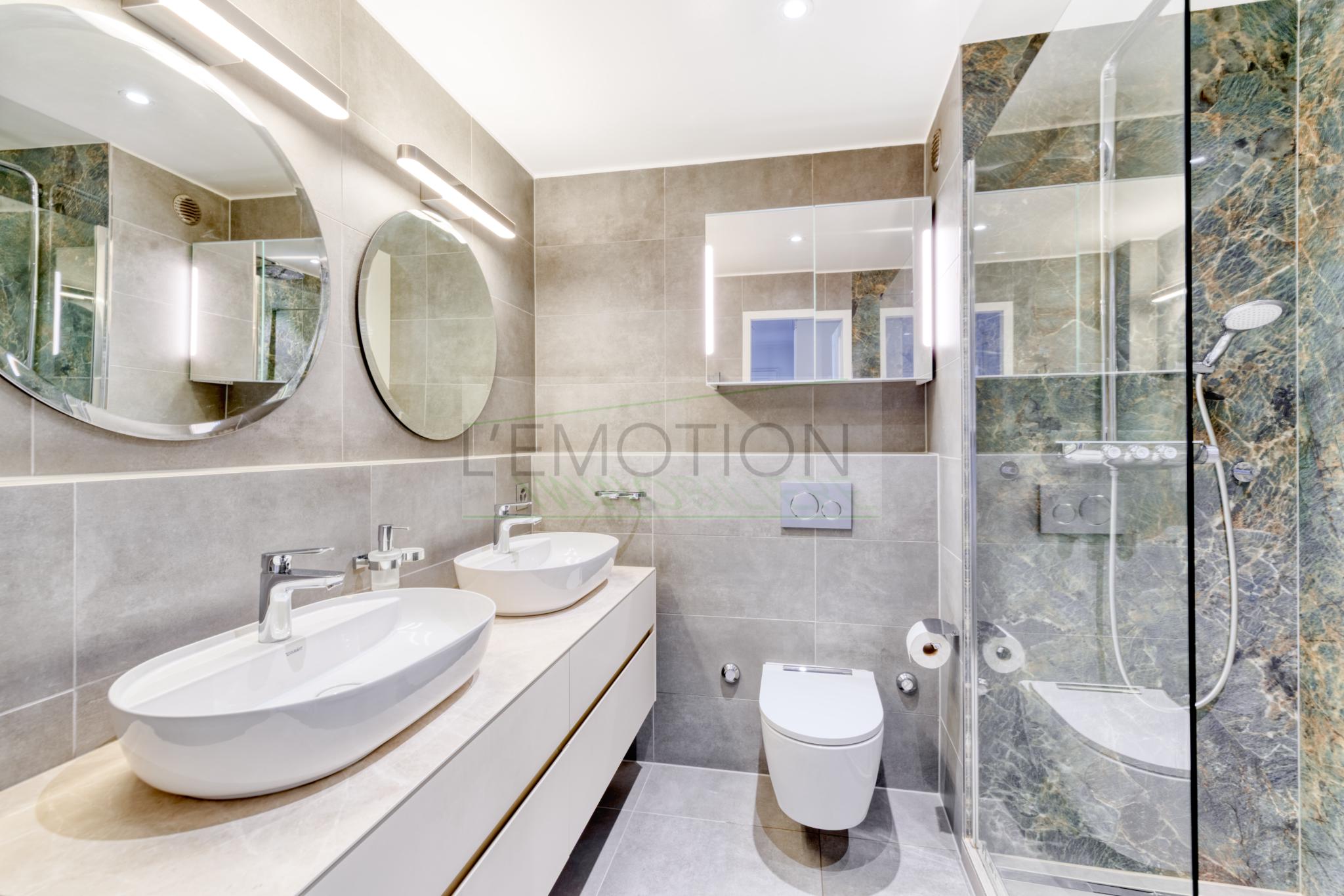 - une spacieuse salle de douche contemporaine (superbe douche italienne en marbre) avec double vasque et toilettes